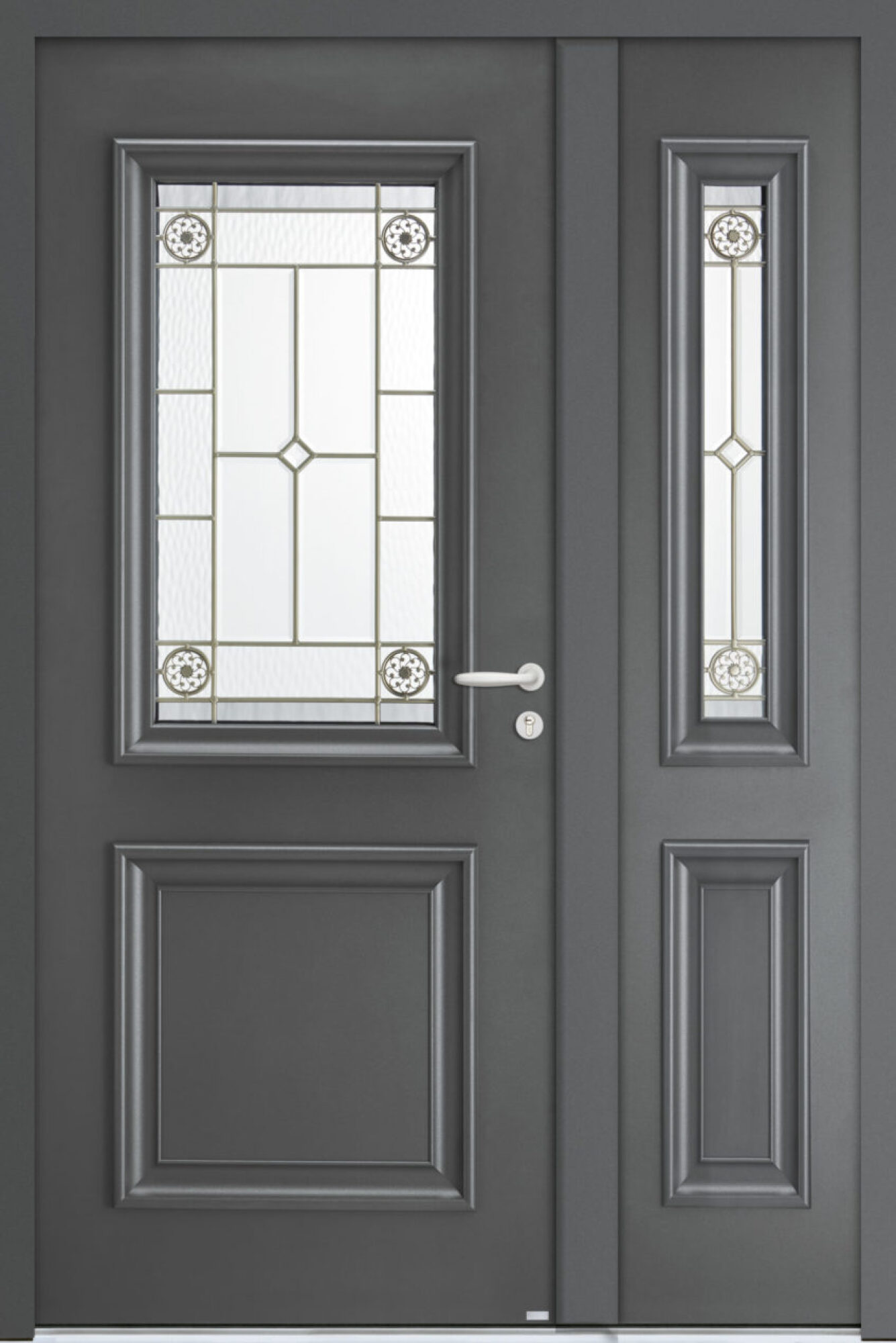 Le double vitrage de classe P2A est doté d'un vitrail décoratif et de petits bois ton étain, ajoutant une touche de charme à votre porte tout en offrant une intimité subtile.