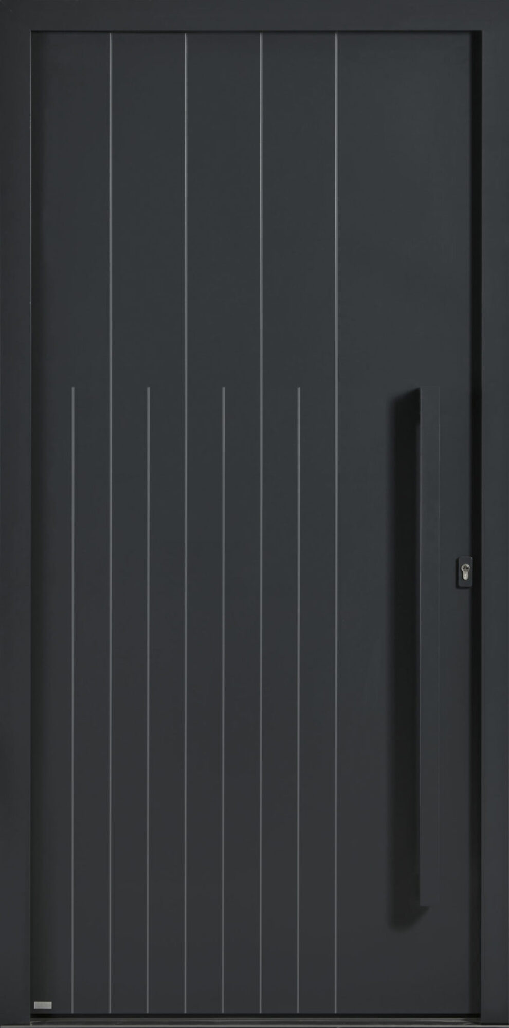 La face extérieure est revêtue d'une finition thermolaquée en noir 2100 texturé, garantie pendant 20 ans, assurant une durabilité exceptionnelle tout en ajoutant une touche d'élégance à votre façade. La face intérieure arbore la même finition, créant une esthétique homogène. Le panneau rainuré des deux côtés de la porte ajoute une texture subtile, tandis que la barre de tirage rectangle de 1100 mm est laquée à la couleur de la porte, ajoutant une touche de modernité à cette porte.